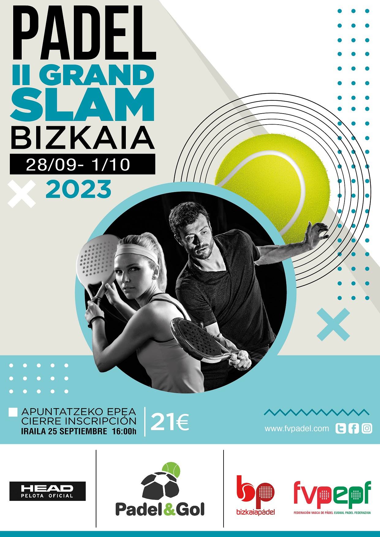 II Grand Slam Bizkaia - Padel&Gol 22/09/2023 ----------------- Inscripción ----------------- Plazo tope de inscripción Lunes 25 de septiembre de 2023 a las 16:00h